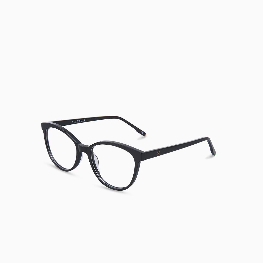 Gafa de acetato de celulosa hipoalergénico de color negro pulido y laminado naranja y transparente en las plaquetas. Componentes OBE.